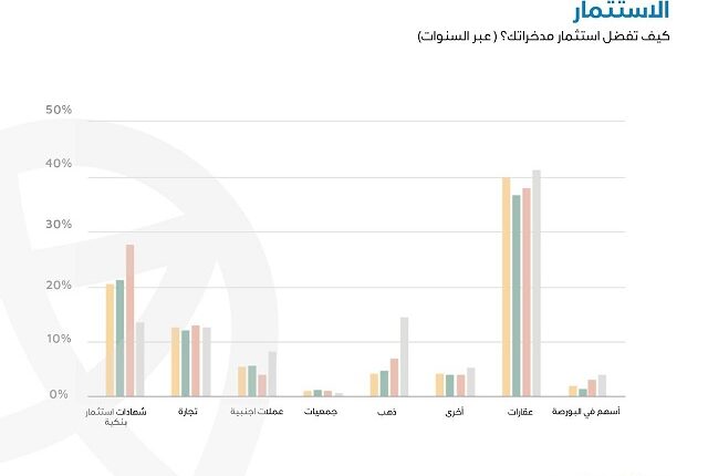 وأظهرت الدراسة أيضًا اتجاه الطبقة مرتفعة الدخل للاستثمار في العقارات، ثم الاستثمار في العملات الأجنبية والشهادات البنكية، كما اتجهت الطبقة متوسطة الدخل إلى الاستثمار في العقارات في المرتبة الأولى، يليها في المرتبة الثانية الاستثمار في الذهب.