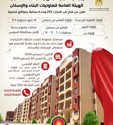 أعلنت الهيئة العامة لتعاونيات البناء والإسكان، إحدى جهات وزارة الإسكان والمرافق والمجتمعات العمرانية، عن فتح باب الحجز لـ ٢٥٣ وحدة سكنية بمواقع متميزة بمشروعات الهيئة: لؤلؤة القاهرة الجديدة – لؤلؤة أكتوبر – لؤلؤة بدر – لؤلؤة العاشر من رمضان – العاشر من رمضان مجاورات (60 – 62 – 64) ، وفى ١٥ مايو مجاورة “۳۱” ، و بمحافظة السويس (عمارات مشروع مدينة الأمل) ، وذلك بمساحات مختلفة.