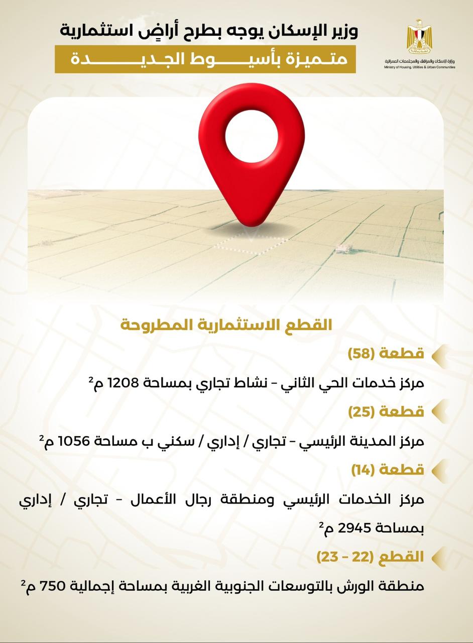 «الإسكان» تعلن طرح أراضٍ استثمارية جديدة بمواقع متميزة بمدينة أسيوط الجديدة…إنفوجراف