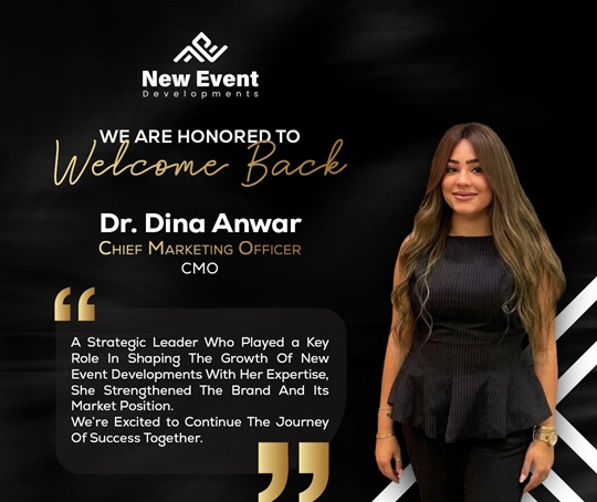 من جانبها قالت الدكتورة دينا أنور، رئيس قطاع التسويق بشركة نيو إيفنت للتطوير العقاري: “سعيدة بانضمامي مرة أخرى لفريق عمل شركة نيو إيفنت للتطوير العقاري، وسنسعى جميعًا لتحقيق خطة الشركة التسويقية والتكامل مع باقي القطاعات الأخرى لتحقيق الأهداف الاستراتيجية للشركة وتعزيز ريادتها بالسوق المصري”.